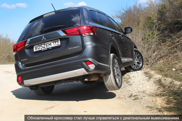 Благодаря усиленной шумо- и виброизоляции и более толстым лобовому и заднему стеклам Outlander стал намного тише. Дополнительно применены специальные динамические демпферы на узлах трансмиссии и заднем подрамнике: с ними вибрации и звук мотора меньше чувствуются при добавлении и сбросе газа. Расположившись на втором ряду, я откинул спинку и… через некоторое время задремал на гравийном серпантине. Модернизированная подвеска тише, не пробивается часто и не раскачивает кузов. Но «стелет» жестковато, на асфальте отмечает малейшие трещины, дрожит на гребенке. Все же с представителями Mitsubishi, говорящими об «универсальности» модернизированной подвески, согласиться сложно.