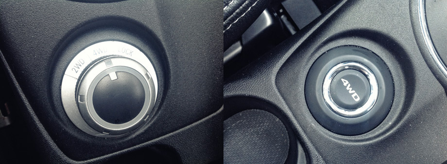 Ещё одна примета свежего рестайлинга — переключатель режимов полноприводной трансмиссии, прежде исполненный в виде поворотной шайбы (на фото слева), стал на том же месте кнопкой 4WD. Режимы (передний привод 2WD, полный 4WD и блокировка муфты Lock) теперь сменяются последовательными нажатиями этой кнопки, перекочевавшей в ASX с Аутлендера.