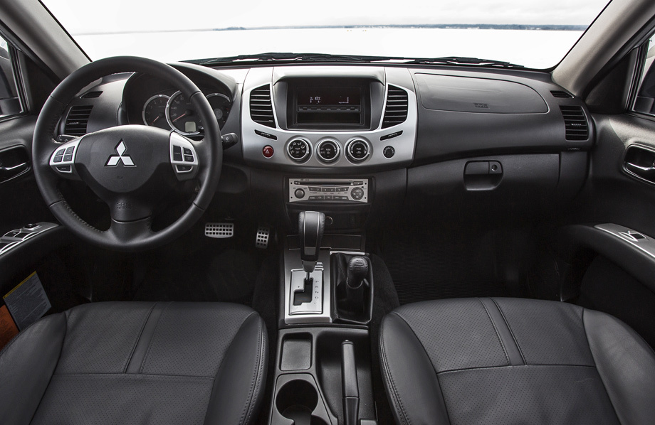 Салон пикапа L200 утилитарен и не претендует на роскошь. Однако, несмотря на обилие жёсткого пластика, тут есть и магнитола во встроенным компасом и бортовым компьютером, и возможность подключения внешних устройств по USB, и климат-контроль, и кожаная обшивка кресел. Все стеклоподъёмники имеют автоматический режим, причём это касается не только боковых стёкол, но и заднего. А вот руль регулируется лишь по высоте и в небольших пределах.