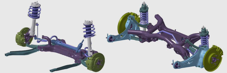 Недавно установленная на ASX задняя подвеска от «третьего» Аутлендера отличается от прежней «эй-эс-иксовской» более жёсткой конструкцией продольных рычагов (выделены голубым цветом) и втулками-сайлентблоками (фиолетовые детали на рычагах), которые призваны уменьшить вибрации.