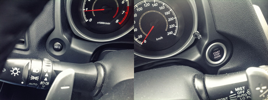 Слева от руля, в тени приятных на ощупь, холодных алюминиевых лепестков, находится кнопка Info (на фото слева), нажатием которой на дисплее сменяются показания бортового компьютера. Её почему-то принято критиковать (дескать, неудобно под руль лезть), но, на мой субъективный взгляд, это удачное решение: привыкнув, не промахнёшься.
