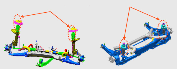 Красными стрелками показаны детали, изменённые во время первой модернизации: на рисунке слева — передние стойки стабилизатора поперечной устойчивости, справа — амортизаторы задней подвески.